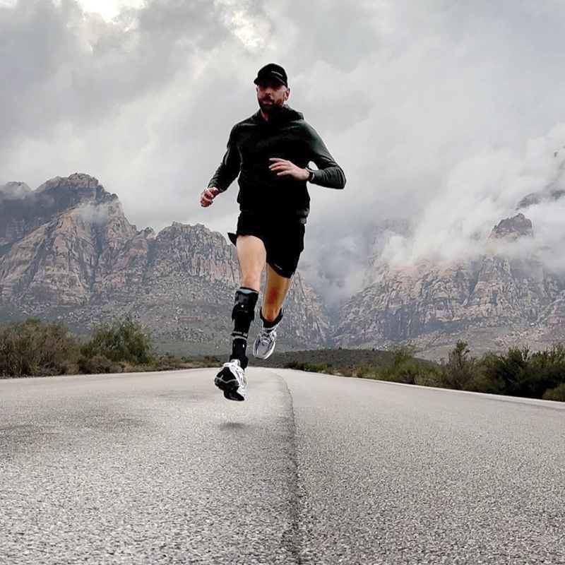 First developed through the Department of Defense as the IDEO (Intrepid Dynamic Exoskeletal Orthosis), the ExoSym is considered more of a dynamic exoskeleton than a brace, says its designer Ryan Blanck, CPO/L, ExoSym program director, Hanger Clinic. The device was developed for injured soldiers to return to combat after high-energy orthopedic injuries that typically might have resulted in elective amputation. Blanck didn’t envision it supporting an ultramarathoner, but built it to withstand the impact as soldiers jumped out of planes and other aspects of full military duty.