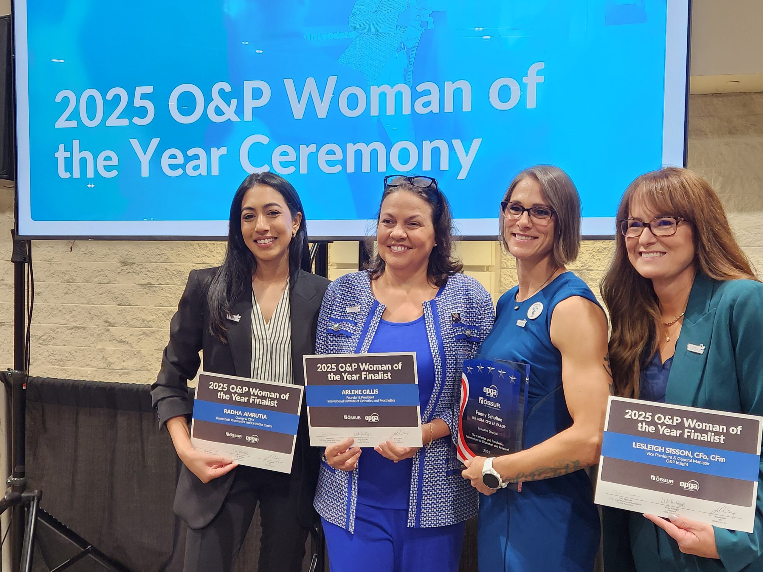 Schultea also congratulated the other finalists: Lesleigh Sisson, CFo, CFm, vice president and general manager, O&P Insight; Arlene Gillis, CP, LPO, MEd, founder and president, International Institute of Orthotics and Prosthetics; and Radha Amrutia, CPO, CMF, owner of Bakersfield Prosthetics and Orthotics Center, California.