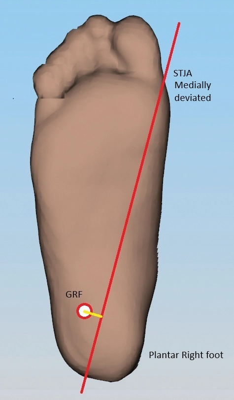 When the GRF passes lateral to the STJA it creates a pronatory torque on the subtalar joint (Figure 1). Excessive or prolonged pronation moments contribute to conditions including adult acquired flatfoot and medial knee stress. Effective orthotic and pedorthic interventions aim to shift the GRF vector medially, thereby reducing the pronatory torque and supporting more efficient load distribution through the foot and lower limb.