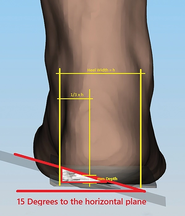 The skive is made in the heel of the orthotic, under the medial aspect of the calcaneus. It starts just anterior to the posterior edge of the orthotic and extends forward to the anterior border of the heel cup. Material is removed from the medial calcaneus in a triangular shape, angled at 15 degrees horizontal. In the days of plaster, this meant filing material off a positive cast, which is now more easily and accurately achieved with digital design software. The result is to flatten the contour of the heel cup on the medial side, pushing the shell up under the heel. This applies an upward force directly beneath the medial calcaneus during weight bearing.