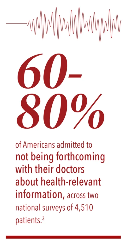 Patient reports that are inconsistent or do not match the evidence we observe may be intentional misrepresentations. Intentional misreporting can involve leaving out relevant information or stating falsehoods. According to a 2019 news article by Lauren Vogel in the Canadian Medical Association Journal, “In two recent national surveys of 4,510 Americans, 60-80 percent admitted they had not been forthcoming with doctors about information that could be relevant to their health.”3 Additionally, “85 percent of patients admitted to concealing or fudging the truth, and roughly a third lied to their doctors. A recent survey of Americans insured under Medicare Advantage plans found that 47 percent lied to their doctors, mostly about their diets, exercise habits, sex lives, or adherence to treatments.”3 Reasons given for this include disagreement with a doctor’s advice, not understanding treatment instructions, and when “asked why they didn’t tell the truth, most said they didn’t want the doctor to judge or lecture them. More than half said they felt embarrassed. Respondents also said they didn’t want to be ‘difficult’ or to waste the doctor’s time.”3