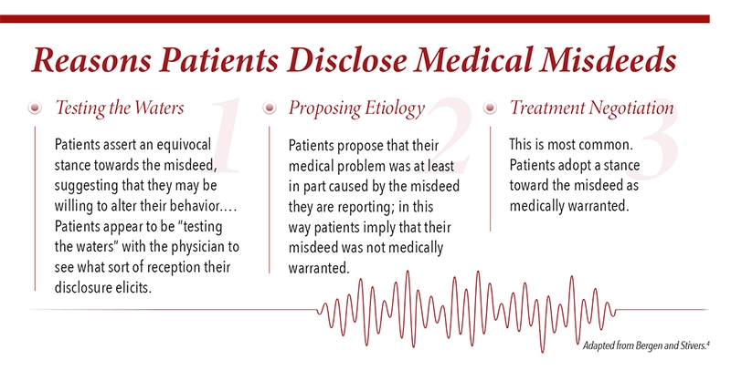 When patients make the difficult choice to reveal information rather than conceal it, this may reflect ambivalence about their care. They may be seeking clarification on our opinion and recommendations so that they can make informed decisions. They may be aware that their misdeed has contributed to a health problem and recognize an obligation to follow our recommendations and adhere to the treatment plan. “Patients show themselves to be oriented to their lack of cooperation as inappropriate but do it nonetheless. Thus, contemporary patients exhibit an ambivalence about the role they want to and should play in their own healthcare, somewhere between passive patient and proactive consumer yet not quite a shared decision-making equal either.”4